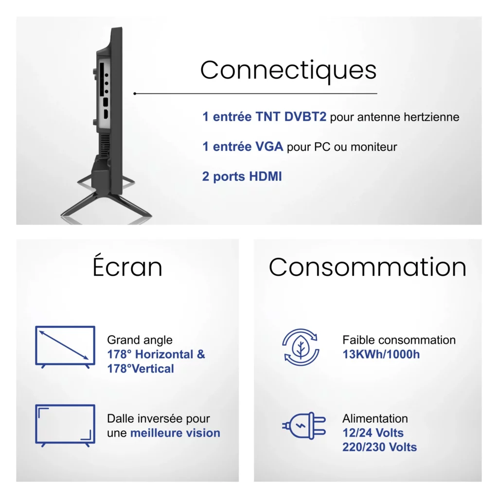 - Un téléviseur camping-car doit impérativement être 12V compatible.